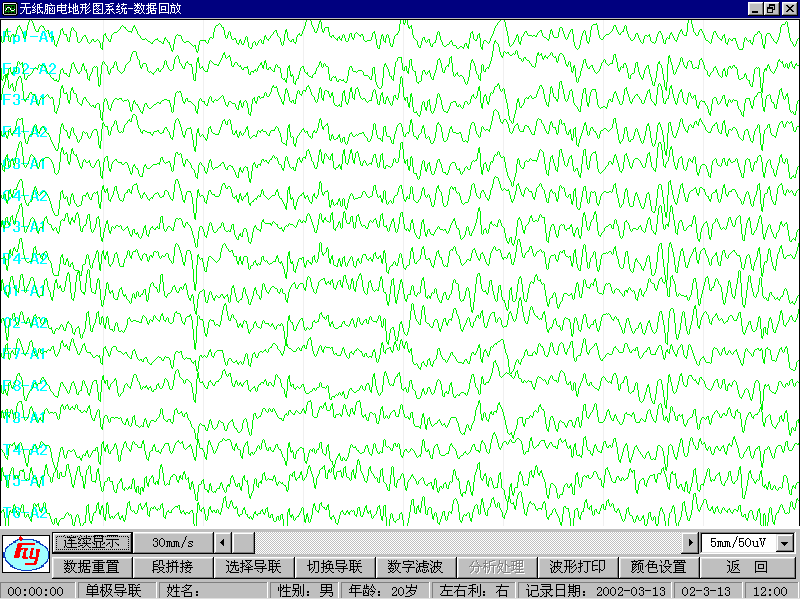 •    导联设置:单极、双极、单双极混合,任意编排。按照国际标准10-20系统,任意选择。